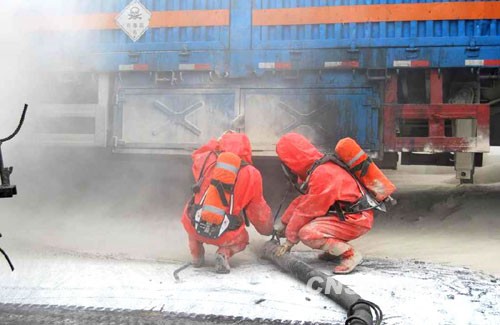 7月24日晨6时20分,宁通高速泰州往扬州方向137公里处一辆装载80桶三氯氧磷(共24吨)的货车在行驶过程中撞上公路护栏,货车上有两名驾乘人员,其中1人轻伤。同时致使约有12桶三氯氧磷发生泄漏,现场被三氯氧磷挥发出的白色气体笼罩。经过当地消防、公安、安监、环保等部门及时赴现场实施救援处置。截至当日下午4时35分,事故现场处置完毕,道路已全部畅通。中新社发 崔佳明 摄
