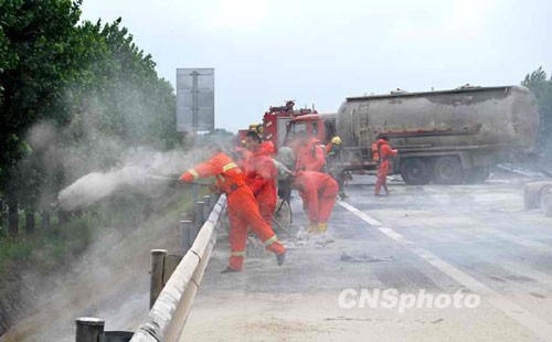 宁通高速扬州段车撞护栏引发三氯氧磷泄漏(2)