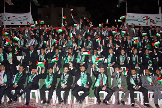 7月24日,在叙利亚首都大马士革附近的一个难民营,382对巴勒斯坦难民举行了一场集体婚礼。图为参加集体婚礼的新郎们。