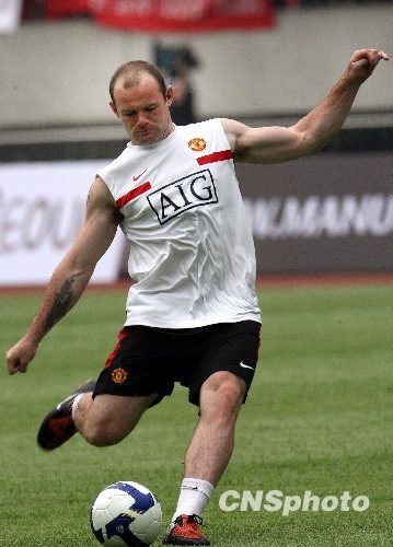 7月25日傍晚,英超“红魔”曼联一行在杭州黄龙体育中心公开训练,备战26日晚与中超球队“浙江绿城”的比赛,曼联的的当家球星鲁尼状态奇佳。中新社发 任晨鸣 摄