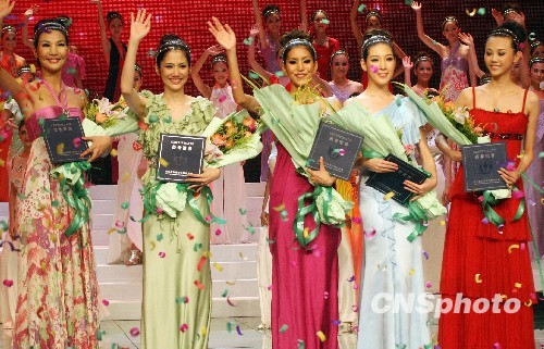 7月25日晚,2009第四届“漓泉杯”亚洲超模大赛在南宁举行第一场大赛,来自日本、韩国、新加波、泰国、马来西亚、印度、越南、蒙古、菲律宾和中国10个亚洲国家的36名选手参加角逐,最后评出5名获得单项奖的模特。图为亚洲超模大赛获得5个单项奖的佳丽。中新社发 钱兴强 摄