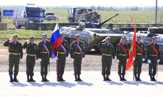 7月26日,受阅的俄罗斯空降兵仪仗兵。查春明 摄