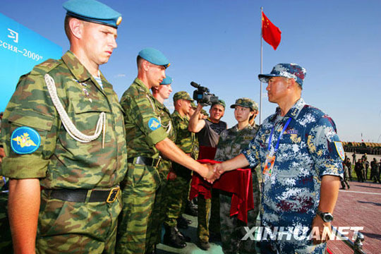 中方总导演马晓天(右一)向俄方参演优秀官兵代表颁发证书和奖章。 查春明 摄