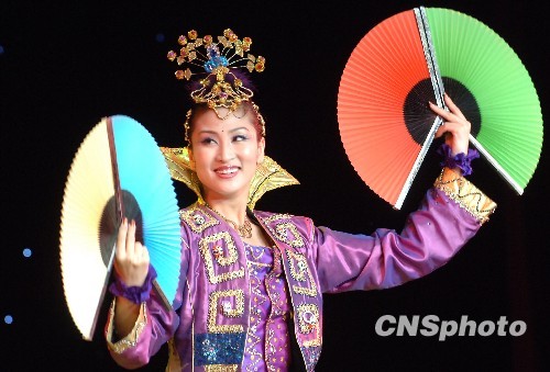 7月26日,世界魔术联盟第二十四界魔术大会在北京隆重开幕,在开幕式上中国少数民族舞蹈家、杂记演员和四名女魔术师表演了精彩奇特的节目。世界魔术联盟魔术大会是国际魔术联盟成立61年来第一次在发展中国家举行的第一次盛会来自世界六十三个国家和地区的两千多名魔术届知名人士表示出席了大会。图为被誉为中国“女魔头”的赵玉莹女士,表演自己的拿手好戏《扇舞新运》。中新社发 邹宪 摄