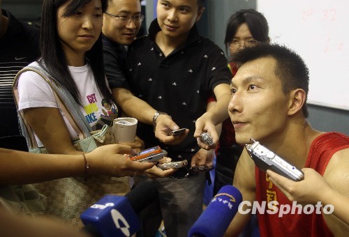 图为易建联接受媒体采访。中新社发 张宇 摄