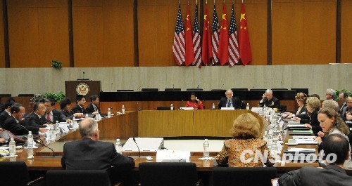 首轮中美战略与经济对话战略对话部分首次会谈27日下午3时在美国国务院举行。首次会谈的主题为中美关系。中国国务委员戴秉国与美国国务卿希拉里·克林顿共同主持会谈。中新社发 李静 摄