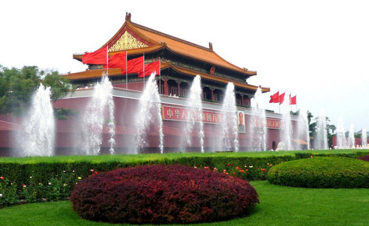 2009年7月27日,北京天安门前的喷泉正在进行调试,各种新颖造型的喷泉景观交替变幻、令人陶醉。
