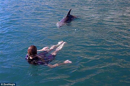 图:“贪玩”海豚缠着女游客不许其上岸(2)