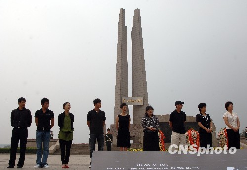 图为电影主创在纪念碑前默哀。中新社发 李学仕 摄