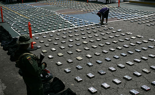 7月27日,在委内瑞拉卡贝略港,国民警卫队士兵在缴获的可卡因旁守卫。委内瑞拉当天在卡贝略港缴获一吨多待运往墨西哥的可卡因,逮捕了46名犯罪嫌疑人。