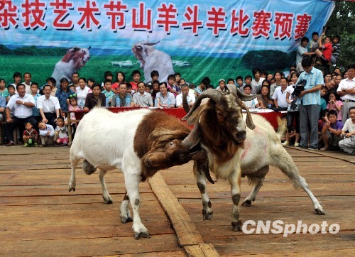 7月27日,安徽临泉县瓦店山羊文化美食节开幕,活动推出杂技武术表演、高跷舞龙表演、斗羊比赛、山羊美食品赏等精彩节目,吸引了众多游客前往观赏。图为精彩的斗羊比赛现场。