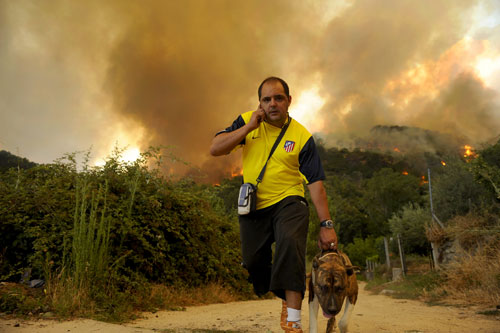 图为阿维拉附近一名男子和他的狗逃离火灾现场。