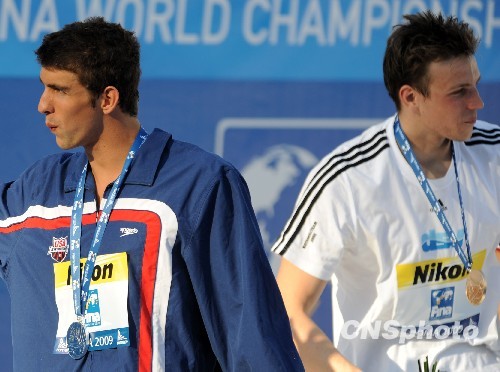 图为菲尔普斯和德国选手比德尔曼领取男子200米自由泳奖牌后各自向观众致意。