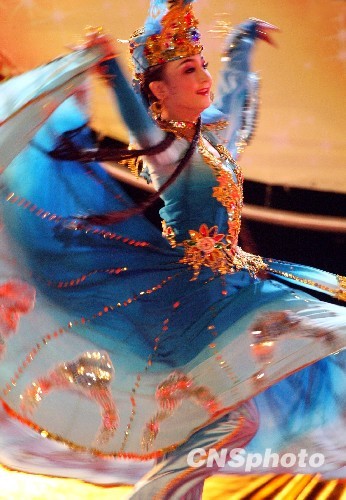 图为在哈密瓜节开幕晚会上,新疆维族姑娘载歌载舞欢庆哈密瓜节开幕。中新社发 钱兴强 摄