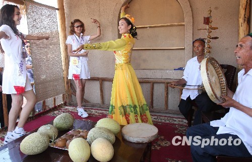 图为参加2009-2010国际旅游小姐中国新疆赛区总决赛的佳丽与维族朋友一起跳舞。中新社发 钱兴强 摄