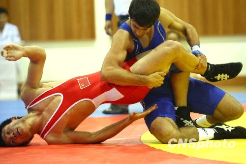 7月29日,中俄青少年运动会进入到第二日的争夺。在下午进行的男子自由式摔跤66公斤级比赛中,俄罗斯运动员阿尔斯拉诺夫(蓝)战胜中国选手李超捧得金牌。中新社发 富田 摄