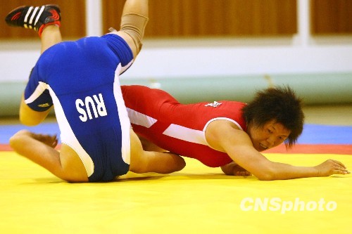 7月29日,中俄青少年运动会进入到第二日的争夺。在下午进行的女子自由式摔跤63公斤级比赛中,中国队张莉芳(红)战胜俄罗斯选手苏什科捧得金牌。中新社发 富田 摄
