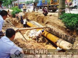 当日上午8时许,记者来到现场看到,广西绿城水务股份有限公司管网管理处的抢修人员还在进行抢修,路面以及附近居民区的积水已经退去。一名抢修人员说,由于7月28日晚下了大雨,市政工程工地发生塌陷,使得埋在地下的供水管道被压坏。受损的供水管是内径500毫米的主水管,共两节,长8米。