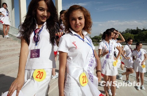 图为来自新疆各地的36位参赛佳丽在哈密市区拍摄花絮。中新社发 钱兴强 摄