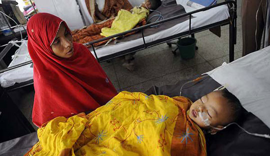 孟加拉国卫生部的最新检测结果表明,死于肾衰竭的25名儿童服用的扑热息痛糖浆含有有毒物质二甘醇。图为服用了有毒糖浆的孩子在孟加拉的医院里正在接受治疗。