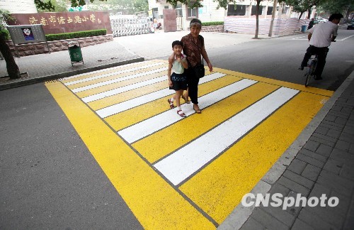 7月30日,济南市交警支队市中区大队近期在纬三路经五路小学门口附近,将原来的白色斑马线改为黄白相间的彩色斑马线,黄白相间的斑马线长7米,宽度由4米增加到5米。目的是给驾驶员带来较强的感官刺激,提醒驾驶员驾车行驶在此地减速慢行。
