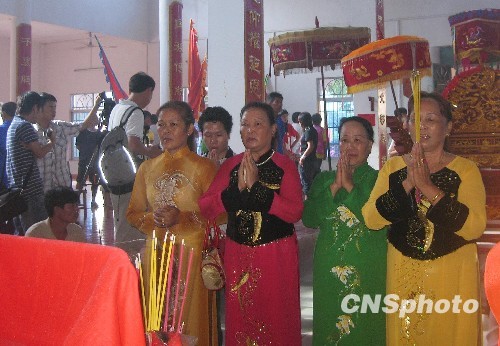 一大早,身着传统服饰的京族民众就争相赶往“哈亭”祭拜祈福,其中亦有不少从仅一河之隔的越南而来的民众。中新社发 袁莺 摄