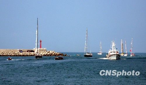7月31日上午9时许,参加第一届海峡杯帆船赛的两岸运动帆船列队进入赛事终点安平港。图为多艘帆船在台湾方面护卫船只引领下入港。
