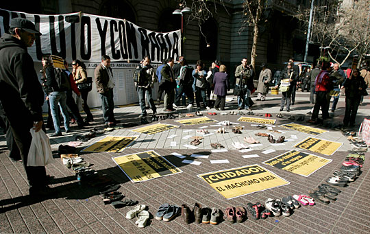 7月30日,在智利首都圣地亚哥举行的反对针对妇女的家庭暴力活动中,象征着被残害和被虐待的妇女的鞋子被摆在地上。
