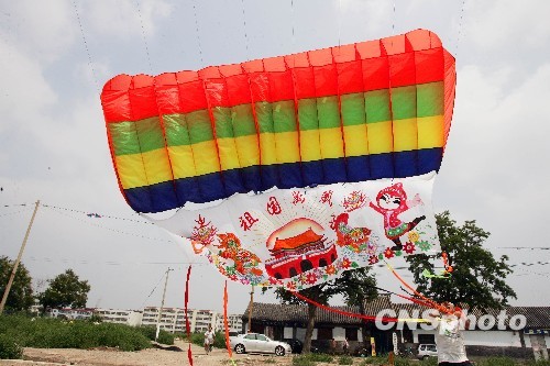 7月31日,在山东潍坊市区,年过六旬的风筝老艺人谭洪所扎制的“祖国万岁”风筝成功放飞。为喜迎共和国六十华诞到来,日前,潍坊市风筝老艺人谭洪特意扎制了面积达30多平方米的“祖国万岁”风筝,风筝整体图案是由天安门和代表吉祥如意的“狮子滚绣球”所组成,充分展现出普通民众庆贺祖国生日的喜悦心情。