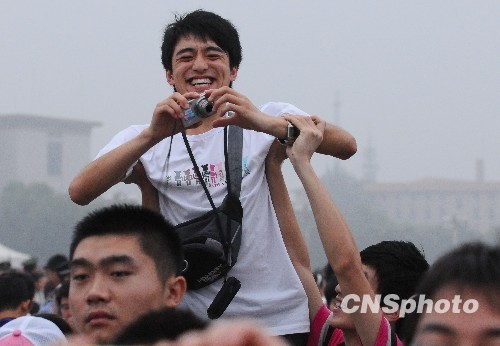 图为一名年轻人被同伴架起,“居高临下”观看天安门广场的升国旗仪式。中新社发 侯宇 摄