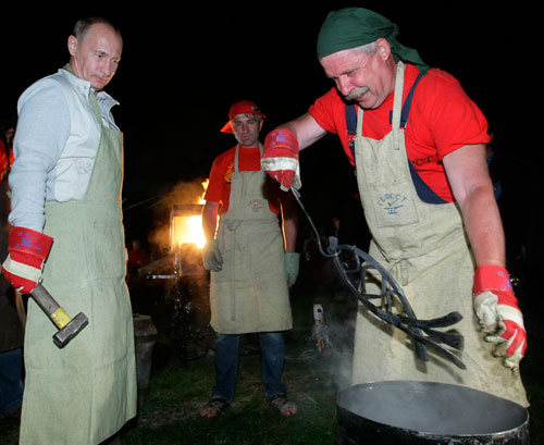 8月1日,俄罗斯总理普京(左)在访问“塔尔茨建筑和民族博物馆”时“学习”打铁。