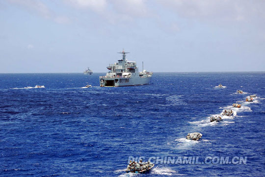 近日,南海舰队某登陆舰支队严格按照新大纲要求施训,与某陆战旅开展联合训练,全面提升部队的登陆能力。图为7月24日,登陆舰正在浮渡装载冲锋舟和两栖坦克的情景。李彦林 摄影报道