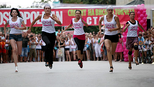 保加利亚索非亚8月2日举行了高跟鞋短跑大赛。本届大赛的参赛者必须穿着鞋跟不少于9厘米的高跟鞋跑完50米的全程。获胜者会得到1500欧元的奖金。