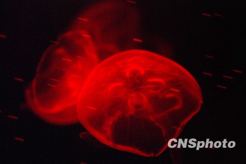 2009年8月2日,青岛海底世界,灯光给海月水母披上了一层神秘的色彩。中新社发 五河 摄
