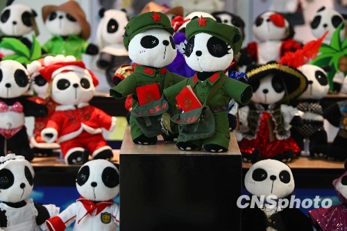 一种可爱敦实、穿红着绿的绒毛熊猫受到青年人的青睐。中新社发 富田 摄