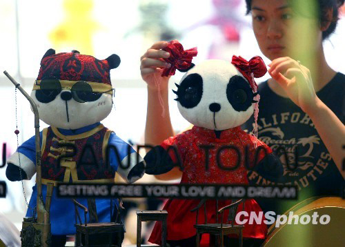 该玩偶有熊猫先生、熊猫小姐、新郎新娘等。中新社发 富田 摄