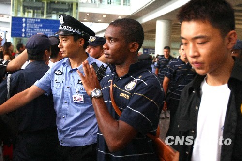 8月4日上午11时30分左右,国际米兰一行40人乘坐汉莎航空班机从德国慕尼黑抵达北京,开启意大利超级杯的备战之旅。国米主席莫拉蒂、主教练穆里尼奥以及包括埃托奥、萨内蒂、坎比亚索、科尔多巴、马特拉齐、斯坦科维奇等在内的国米球星悉数抵达。图为埃托奥走出机场。中新社发 富田 摄