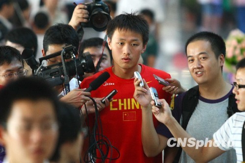 图:中国游泳队载誉抵京 张琳成关注焦点(3)