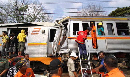 8月4日,印尼两列客运列车在茂物市相撞,造成至少1人死亡,60人受伤。图为救援人员检查损毁的列车。