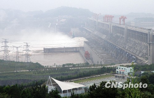 2009年8月4日,三峡水库入库流量达每秒45000立方米,三峡大坝开闸泄洪调度今年长江入汛以来的最大洪峰,三峡水库坝前水位降至144.85米。中新社发 刘君凤 摄