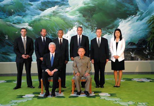 8月4日,朝鲜最高领导人金正日在平壤会见了来访的美国前总统克林顿。图为金正日和美国前总统克林顿在平壤合影。