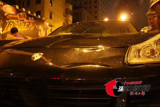 在这辆保时捷身后25米的地方,是一条醒目的爱心斑马线,目击事故的电视台保安说,当时大约9点半,被撞死的是个姑娘,大约20岁,当时身边还有个女伴在一起的。“轰的一声,我转头去看,斑马线上有个女生的挎包。斑马线前一二十米远的地方就是这辆保时捷,那个女生人已经飞到了离斑马线大约30米远的地方,一动不动了。”
