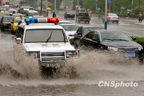 图为当地一主干道严重积水,车辆如在河中通行。中新社发 曹多然 摄