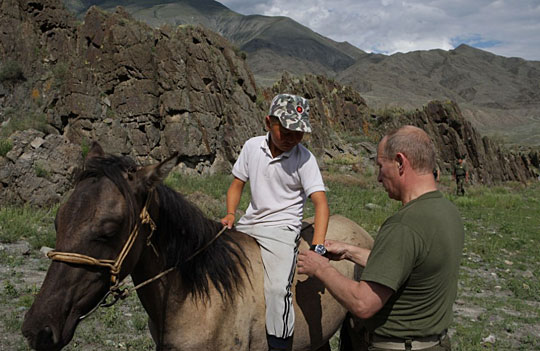 据英国媒体8月4日报道,俄罗斯总理普京决定在图瓦共和国度过自己为期一天的假期。普京参观了当地牧羊人简朴的住处,并把自己戴的手表摘下来送给牧羊人的儿子作为纪念,他还把自己的猎刀赠给热情好客的牧羊人。
