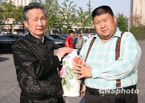 图为中国工艺美术大师陈扬龙(左)向毛新宇赠送《和谐盛世·富贵中华》瓶。中新社发 徐曦弋 摄