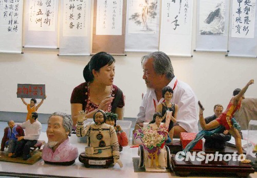 图为何晓铮大师与弟子交谈,前面是他的经典面塑作品。