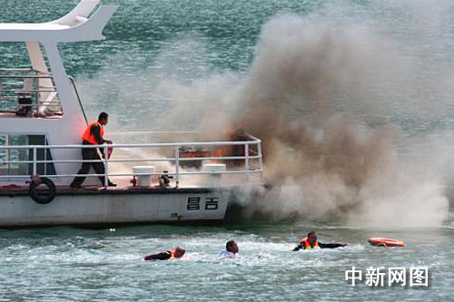 在应急演习假想现场,代号为“天池68”与“天池60”的两艘游船因天池水面升起大雾,能见度非常低,两船躲闪不及相撞,“天池68”船舰位置起火。船上的游客惊慌失措,大声呼喊“救命”。工作人员立即组织游客向船首转移并向阜康海事处求援。但在转移过程中,有人失足落水。