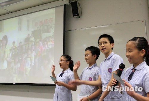 八月五日,香港小学生在香港大学透过线上互动教学连线,与四川地震灾区德阳市袁家小学的学生互相切磋交流。当日,川港学生线上电子学习平台启动仪式在香港大学举行。协助四川袁家小学的重建工作是香港大学“四川地震圆桌行动”策划的其中一项灾后重建活动。中新社发 张勤 摄