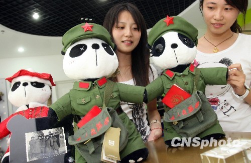 两个女孩被怀旧扮相、穿军装的熊猫玩偶吸引。中新社发 陈晓根 摄