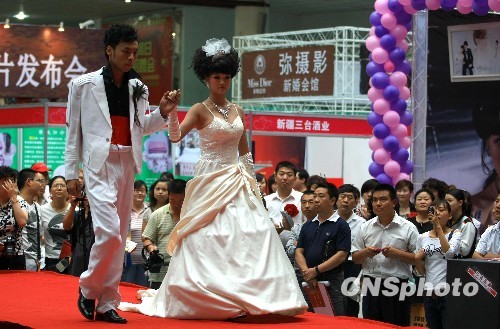 8月6日,新疆首届婚庆博览会在新疆国际博览中心举行,众多商家推出婚纱、摄影、首饰、酒水、糖果、婚庆等一站式服务,吸引民众。图为婚博会现场的婚纱秀。中新社发 刘新 摄